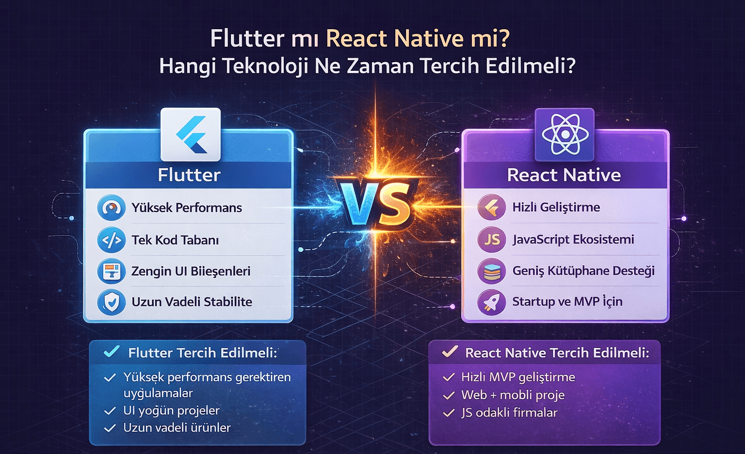 Flutter ve React Native arasındaki farklar nelerdir? Hangi projede hangi teknoloji tercih edilmeli, avantaj ve dezavantajlarıyla öğrenin.